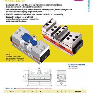 - Sử dụng Thép FCD 60 cho độ cứng cao và cũng có hệ thống khóa tự động kéo chi tiết gia công xuống vị trí chính xác trong vòng 0,01mm dưới 4500kg áp lực, Ê tô này này phù hợp nhất cho độ chính xác tạo khuôn cho các Trung tâm Gia công.