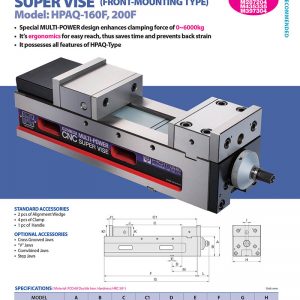 - Sử dụng Thép FCD 60 cho độ cứng cao và cũng có hệ thống khóa tự động kéo chi tiết gia công xuống vị trí chính xác trong vòng 0,01mm dưới 4500kg áp lực, Ê tô này này phù hợp nhất cho độ chính xác tạo khuôn cho các Trung tâm Gia công.